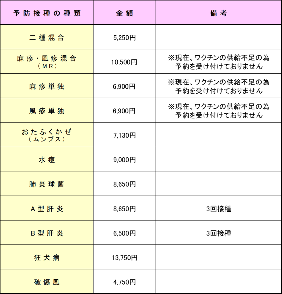 予防接種はワクチンの在庫を置いていない為、予約が必要です。(取り寄せに2~3日かかる場合があります。)予防接種をご希望の方は、午前は8:30~11:00まで、午後は14:30~16:00までの受付です。小学生未満のお子さんの予防接種は平日午後のみの受付です。