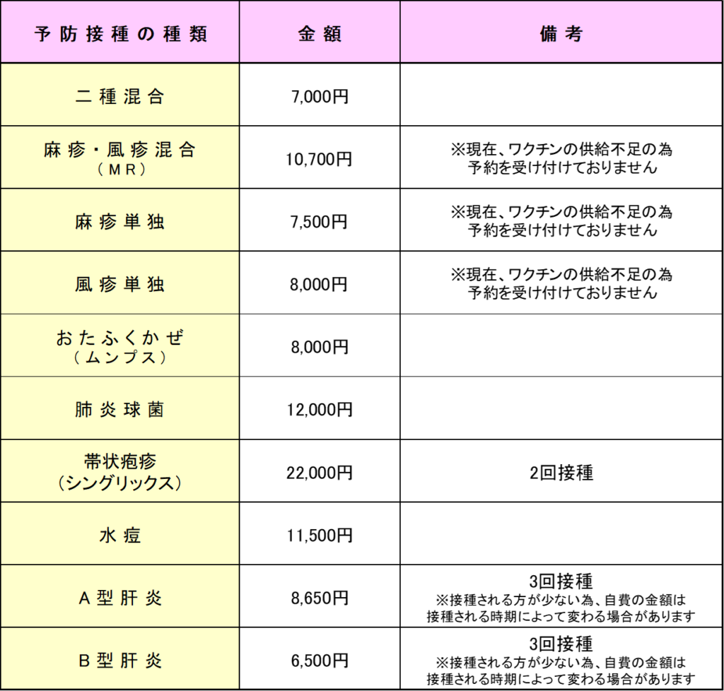 その他自費で接種の場合の金額はこちらです